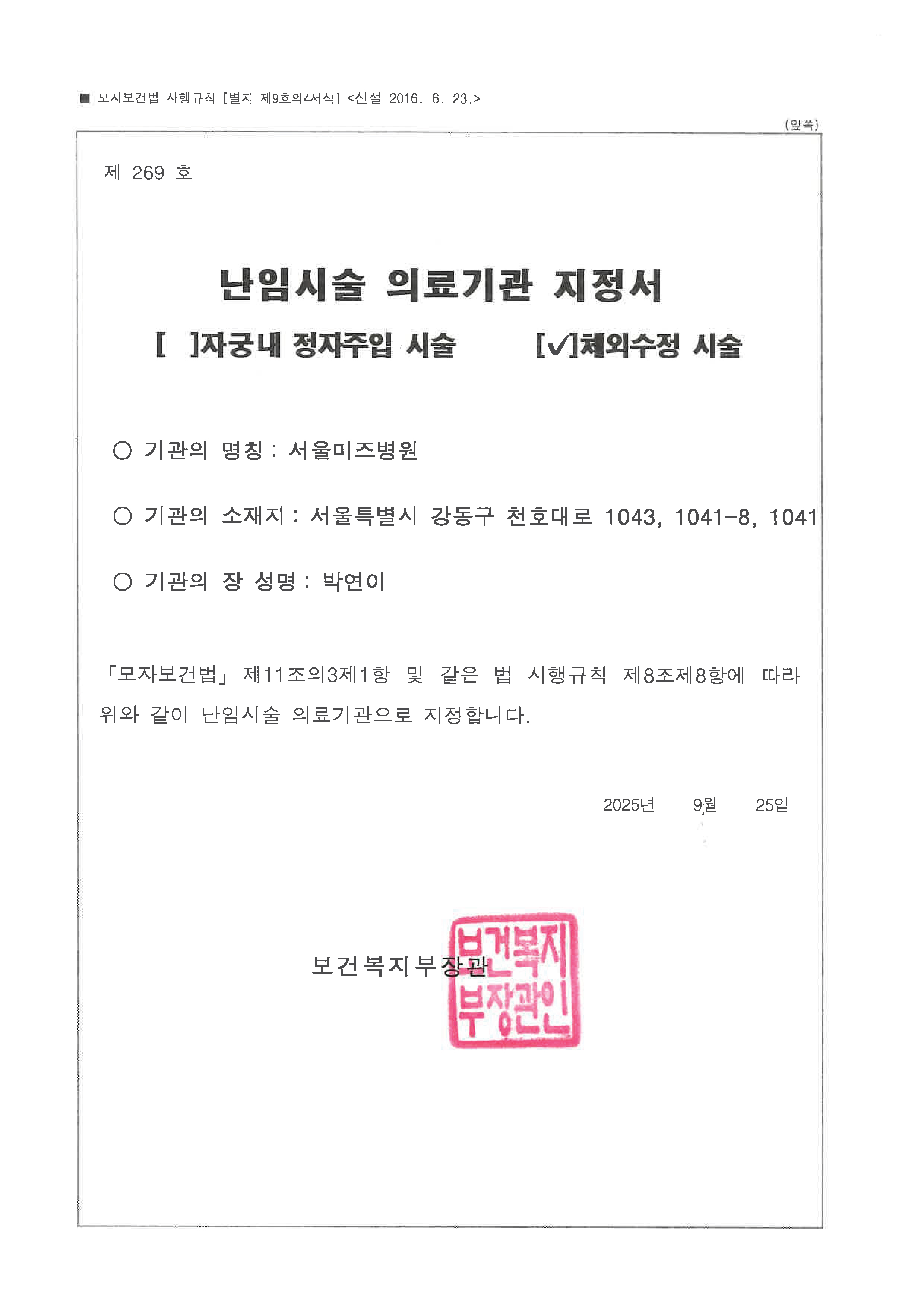 서울미즈병원 프로미스 IVF는 2025년 9월 25일, 보건복지부로부터 「모자보건법」제11조의3제1항 및 같은 법 시행규칙 제8조제8항에 따라 '난임시술 의료기관'으로 지정되었습니다. 이에 따라, 모든 난임 진료 및 시술이 가능하며, 난임 시술비 지원금도 받으실 수 있습니다.