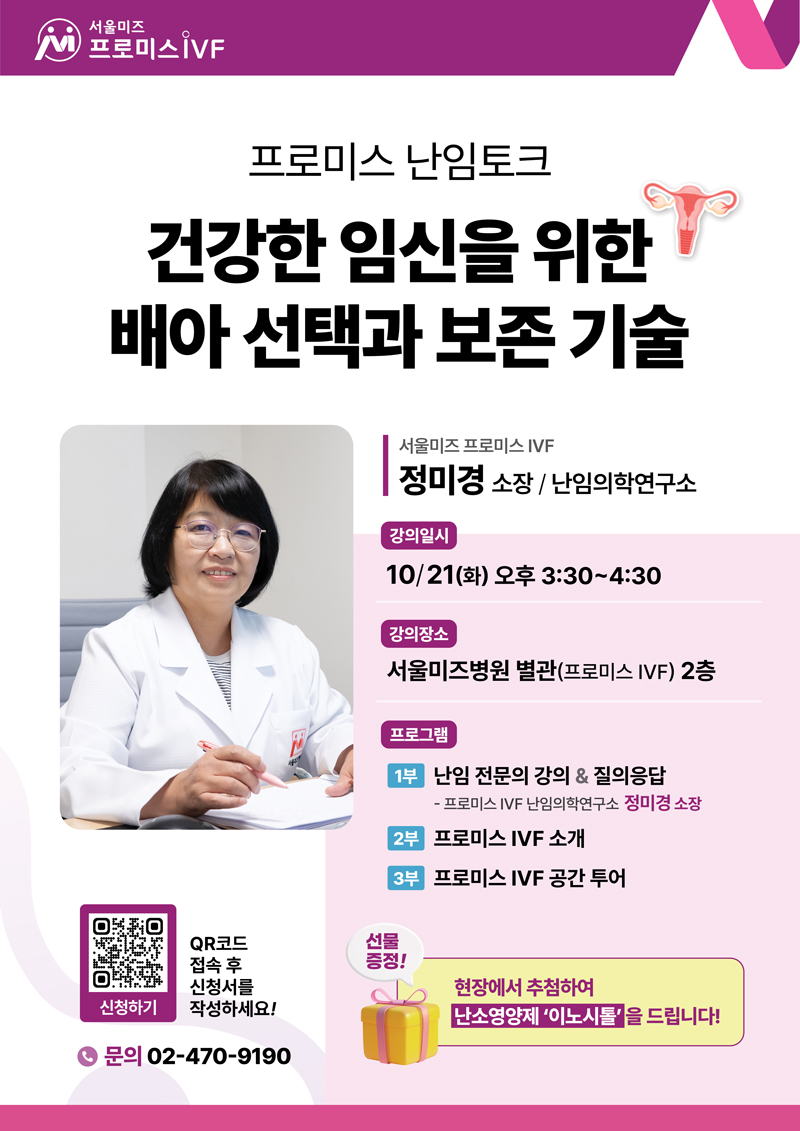 ‘프로미스 난임토크’ 에 여러분을 초대합니다! 30년 경력의 배아연구 전문가 서울미즈 프로미스 IVF 난임의학연구소 정미경 소장님이 직접 들려주는 <건강한 임신을 위한 배아 선택과 보존 기술> 일시 : 10월 21일(화) 오후 3:30 ~ 4:30 장소 : 서울미즈병원 별관(프로미스 IVF) 2층 10월 21일 오후 3시 30분 따뜻한 소통의 자리에 함께해주세요♡ >> 신청하러 가기 >> 감사합니다. |