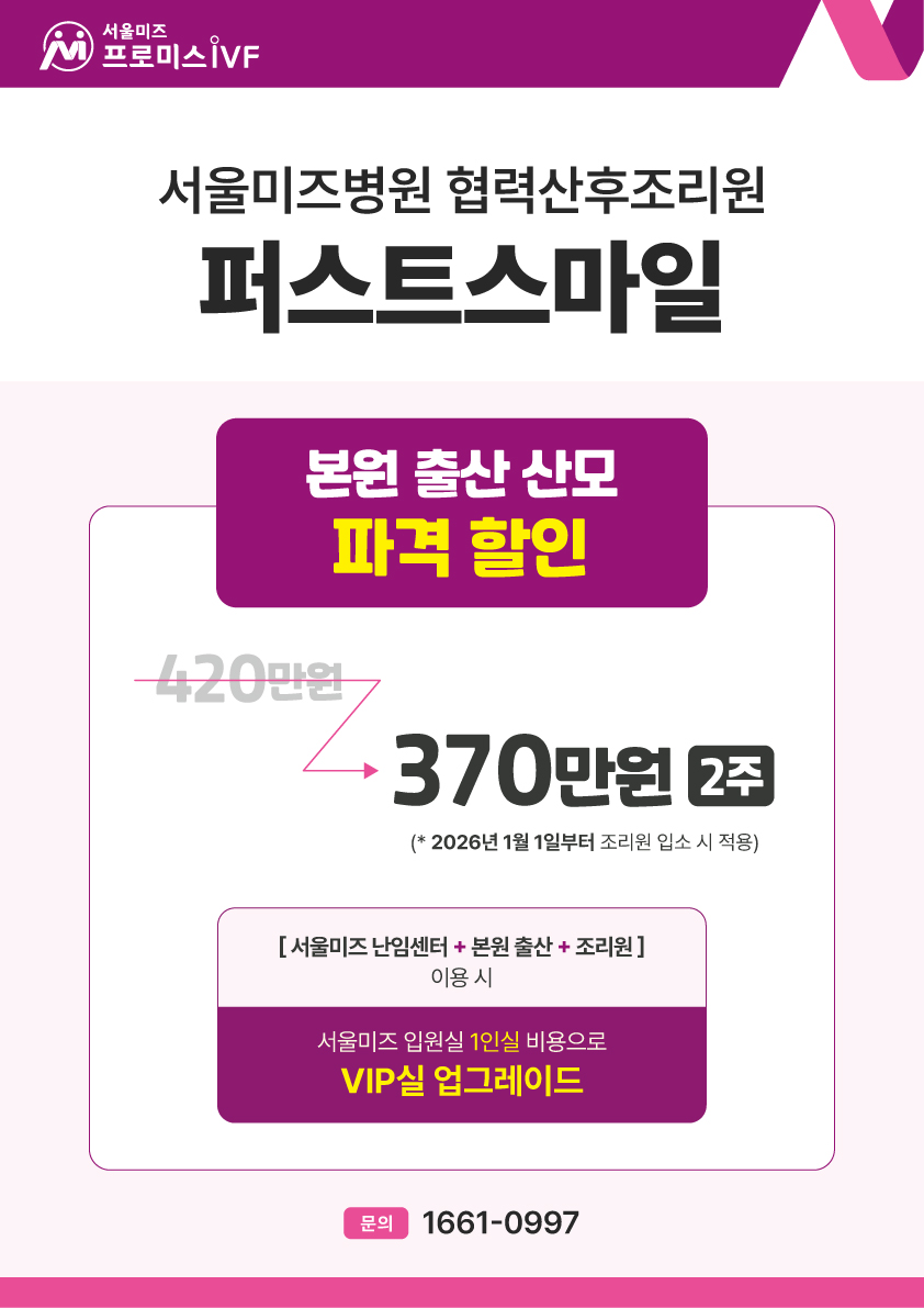 안녕하세요. 본원에 인접해있는 산후조리원인 퍼스트스마일과 협력하여 본원 출산 산모님들께 할인 이벤트를 진행합니다. 본원 출산 산모 한정 2주 370만원(기존 420만원) (*2026년 1월 1일부터 조리원 입소 시 적용) 서울미즈 난임센터 + 본원 출산 + 조리원 이용 시 서울미즈 입원실 1인실 비용으로 VIP실 업그레이드 적용해드리니, 많은 관심 부탁드립니다. 자세한 사항은 문의주시면 친절한 안내 도와드리겠습니다. 감사합니다. * 퍼스트스마일 산후조리원 문의 : 1661-0997 |